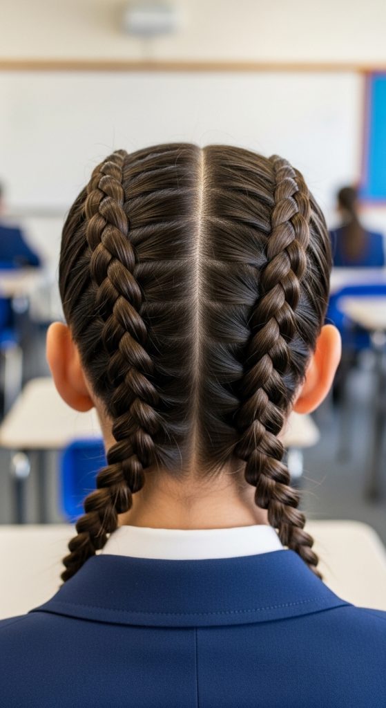 Part the hair down the center and secure one side temporarily. Divide the first side into three strands and braid downward, securing with an elastic. Repeat on the other side. Ensure both braids are equal in size and tension. This style is easy to maintain and works well for active school schedules.