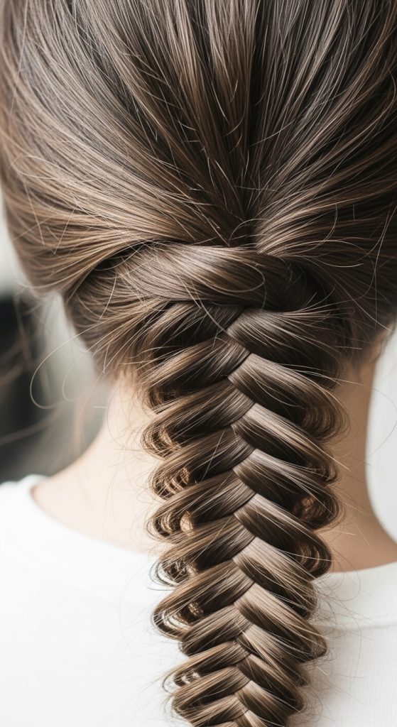 The fishtail braid creates a detailed pattern using two sections instead of three. This technique produces a textured appearance while remaining secure and functional for school use. It is suitable for students who want a slightly different braid style without adding complexity.