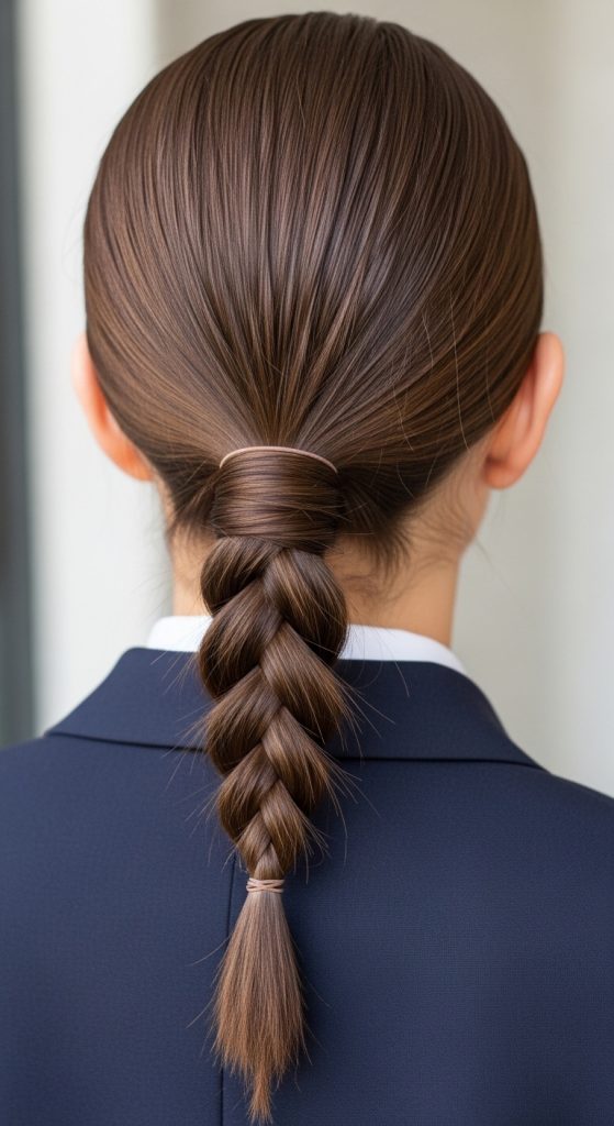 Start by brushing the hair and gathering it at the nape of the neck. Secure it into a low ponytail using an elastic band. Divide the ponytail into three sections and create a standard braid by crossing strands alternately. Continue until reaching the ends and secure with another elastic. Ensure the braid remains tight to maintain its shape throughout the day. This style reduces loose strands and helps maintain organization. It is also adaptable, allowing slight variations in placement or tightness to suit individual preferences.