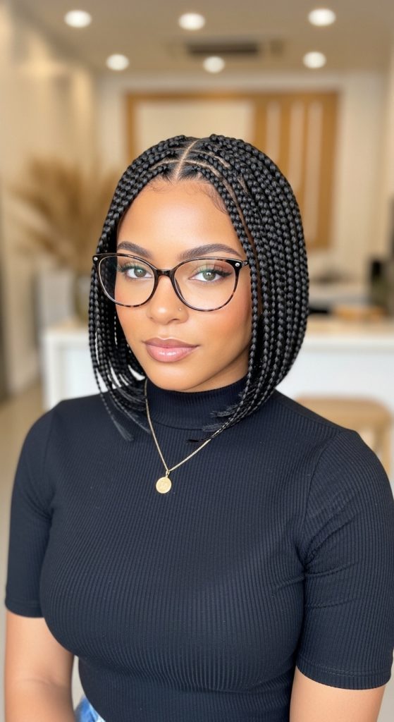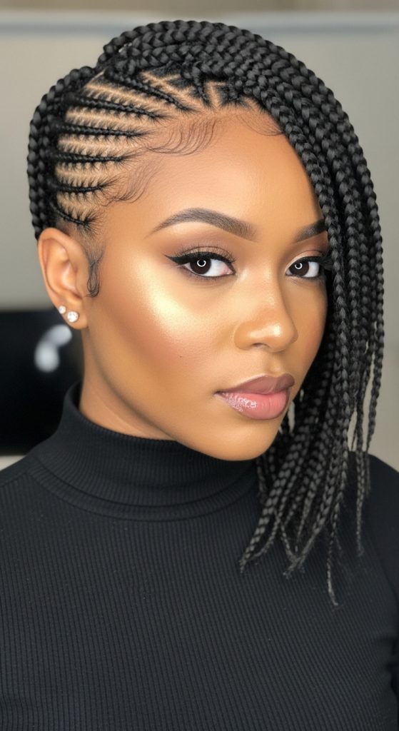 A side part introduces asymmetry into short braided styles, creating a dynamic and modern appearance. This design is commonly featured in Pinterest inspiration because it enhances visual balance while maintaining simplicity.