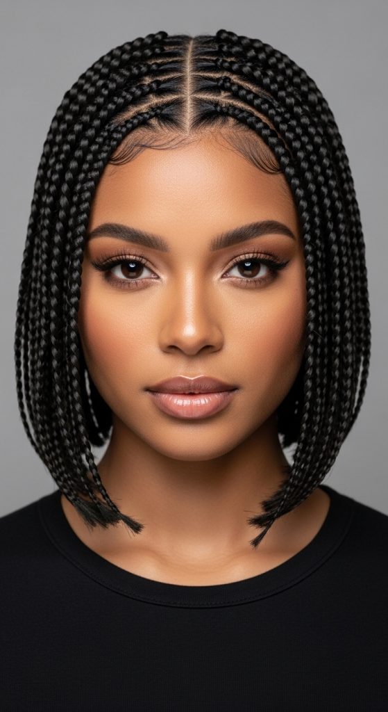 To create this look, section the hair evenly and begin braiding using either traditional or knotless methods. Ensure that each braid is cut or finished at the same length to maintain consistency. Use hot water to seal the ends if extensions are used. Check alignment throughout the process to ensure the bob shape remains even. This method produces a polished and balanced hairstyle that is easy to manage and style.
