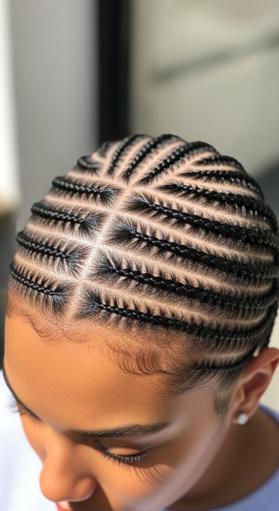To achieve this look, part the hair into rows using a comb. Apply gel to each section for control and begin braiding close to the scalp, incorporating hair as you move along the row. Continue until reaching the end of each section. Repeat across the head, ensuring consistent spacing and direction. This method produces a structured and long-lasting hairstyle.