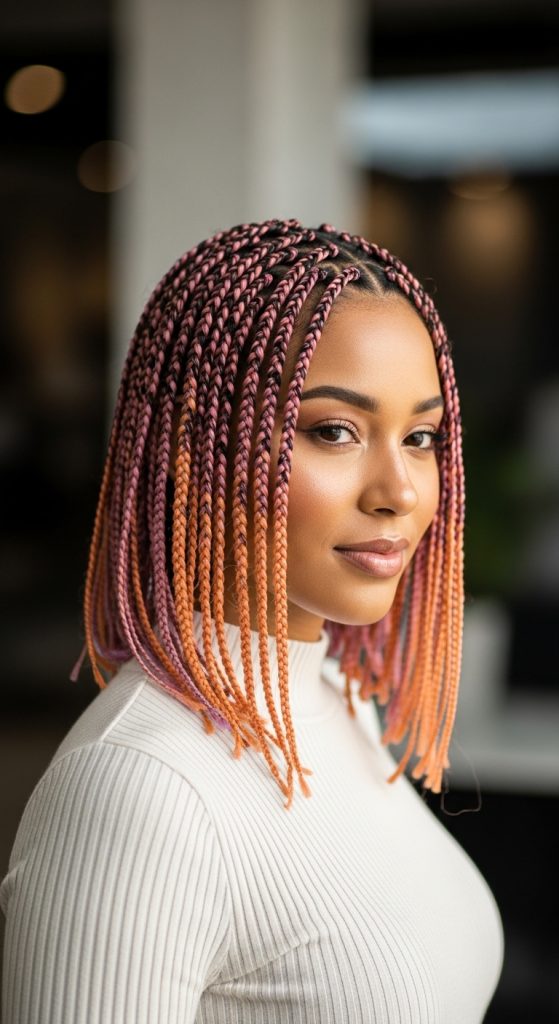 Incorporating colored extensions into short braids adds contrast and personalization to the hairstyle. This style aligns with modern design trends that emphasize individuality and creative expression.
