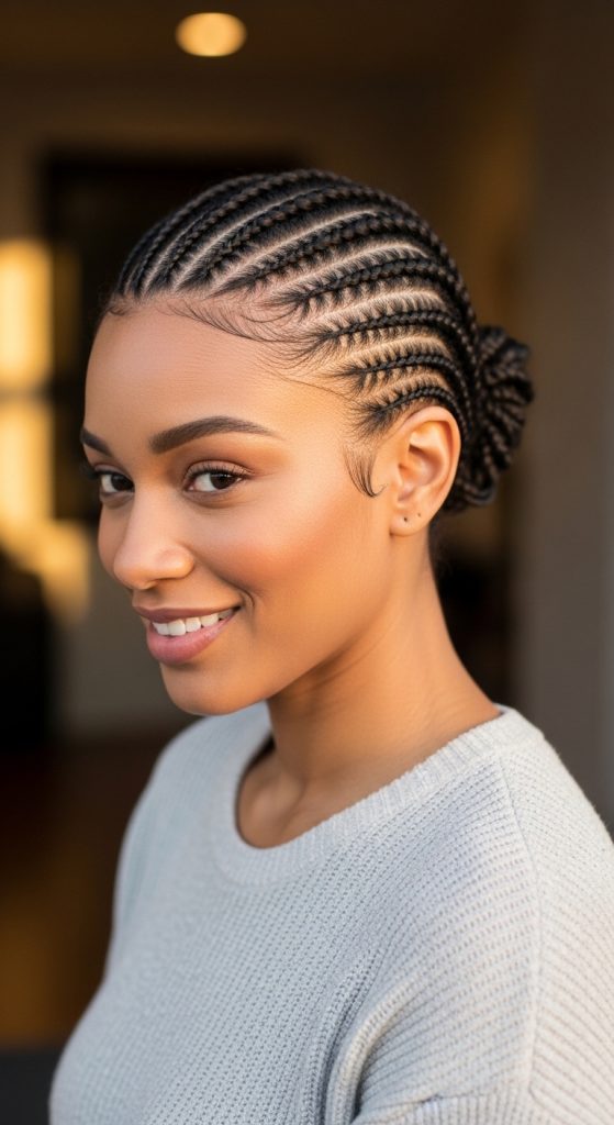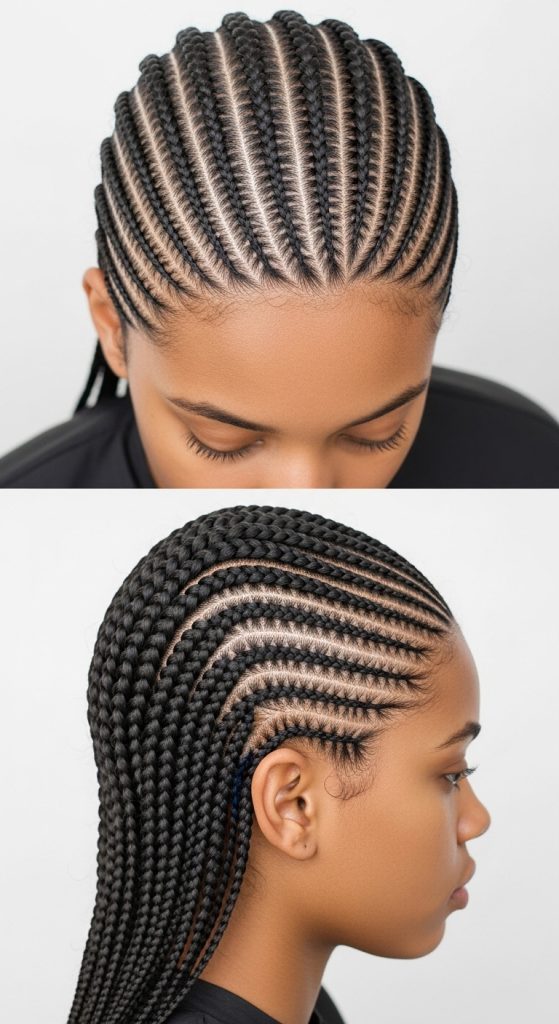 Short cornrow braids are created by braiding the hair close to the scalp in straight or curved patterns. This style is valued for its clean and organized appearance, making it a common choice in Pinterest tutorials. The shorter length enhances comfort and simplifies maintenance.