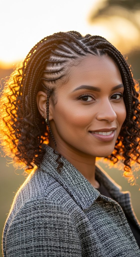 Short braids with curly ends combine structured braiding with soft texture, creating contrast and visual interest. This style is often included in creative ideas because it blends two techniques into one cohesive design. The curly ends add movement while maintaining the practicality of short braids.