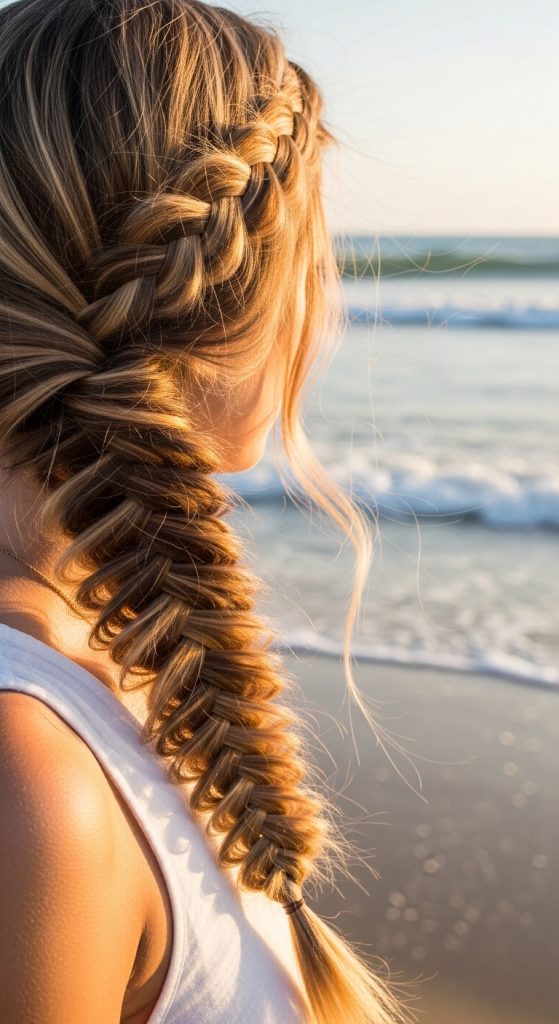 A braided ponytail offers a secure and practical solution for beach environments. It keeps hair controlled while preventing tangling caused by wind and movement. This style is both functional and visually appealing, making it a popular choice in creative ideas for long hair.