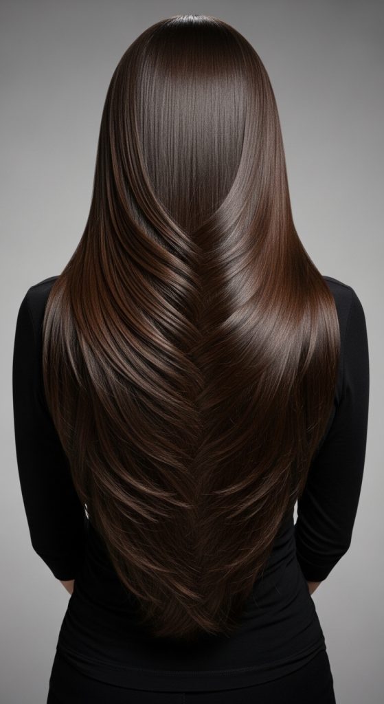 A long V-cut layered hairstyle is defined by the shape created at the back of the hair. Instead of ending in a straight horizontal line, the hair tapers into a soft V shape that gradually narrows toward the center. This shape allows the longest strands to remain at the middle of the back while the outer edges become slightly shorter. The layered structure enhances the V shape by introducing movement throughout the hair. For individuals who want to keep their long hair length while adding visual structure, this haircut provides an effective solution.