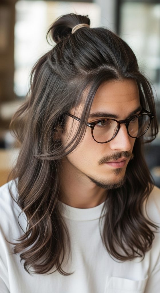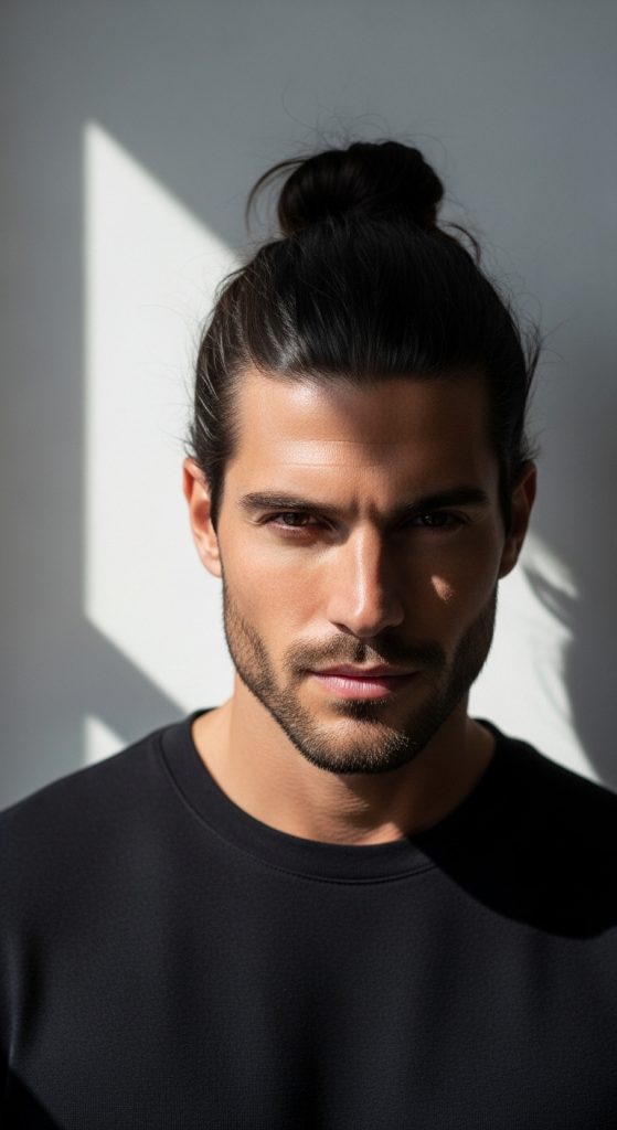 A man bun provides a structured and modern approach to styling long hair. This design keeps the hair secure while maintaining a clean appearance.