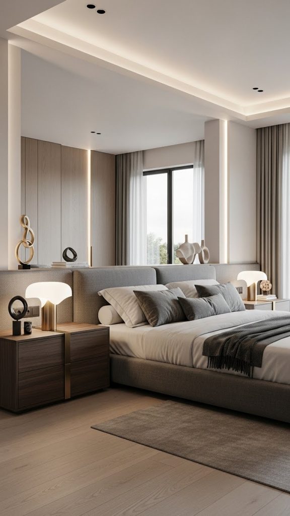 Modern luxury master bedrooms feature clean lines, minimal décor, and high-end materials. Neutral tones are paired with subtle metallic or wood accents.