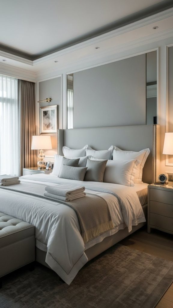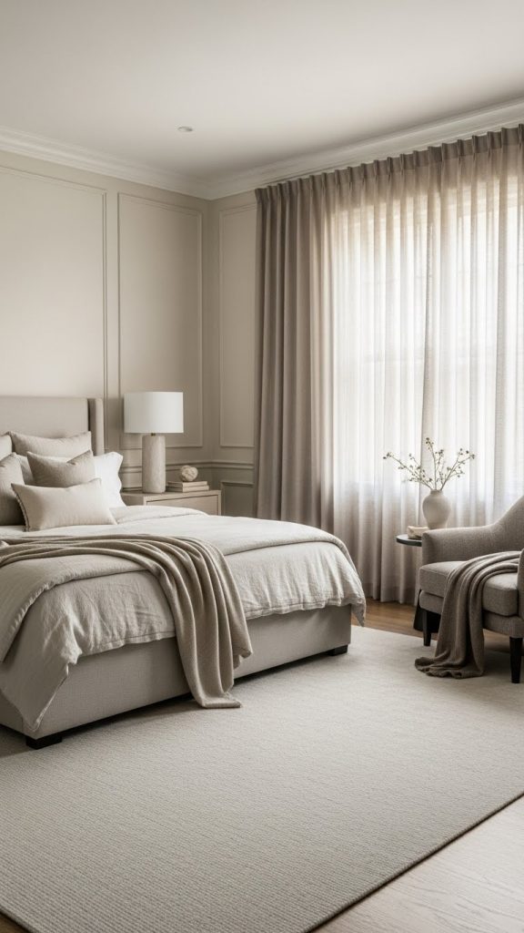 Neutral luxury master bedrooms use soft shades like beige, cream, taupe, and warm grey. Texture plays a key role through bedding, rugs, and curtains.