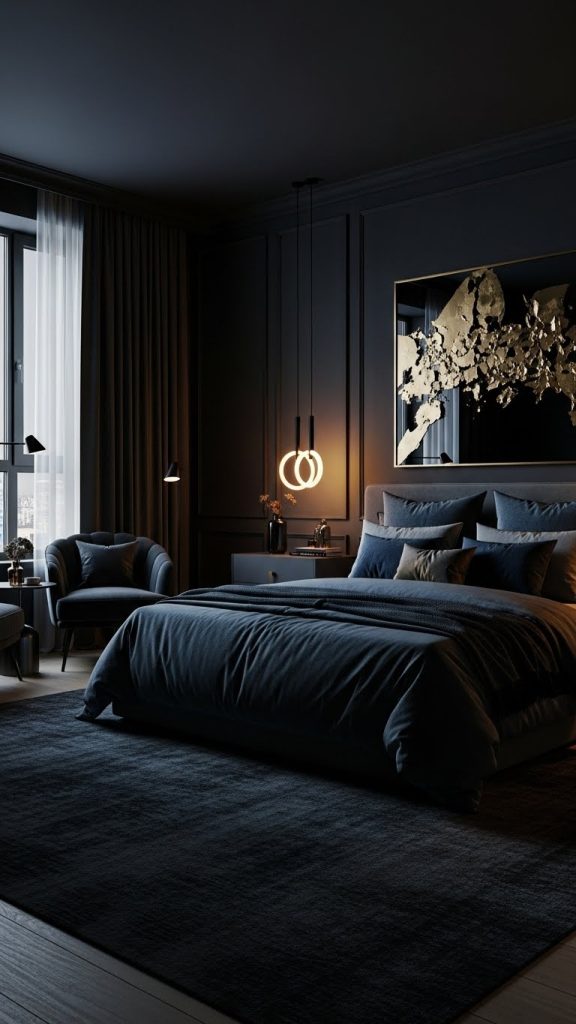 Dark luxury master bedrooms use rich colors like charcoal, navy, or deep green. When paired with warm lighting and plush fabrics, dark tones feel cozy and dramatic.
