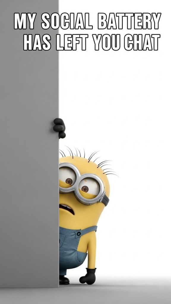 Minions hiding, avoiding people, or staring blankly with captions like “My social battery is dead.” These memes are especially relatable to introverts who love people—but only in limited doses.