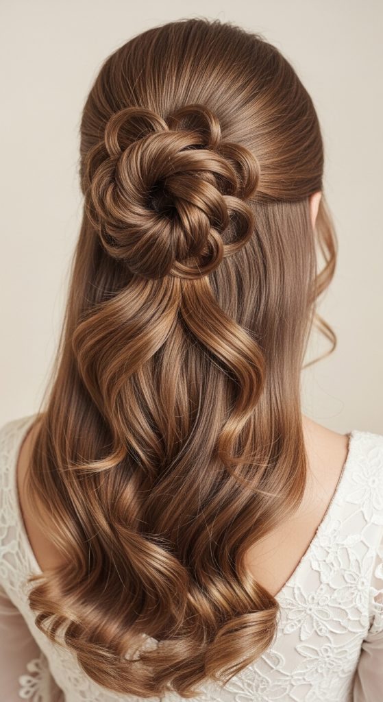 This style combines an updo with loose flowing ends, creating a structured yet soft appearance.