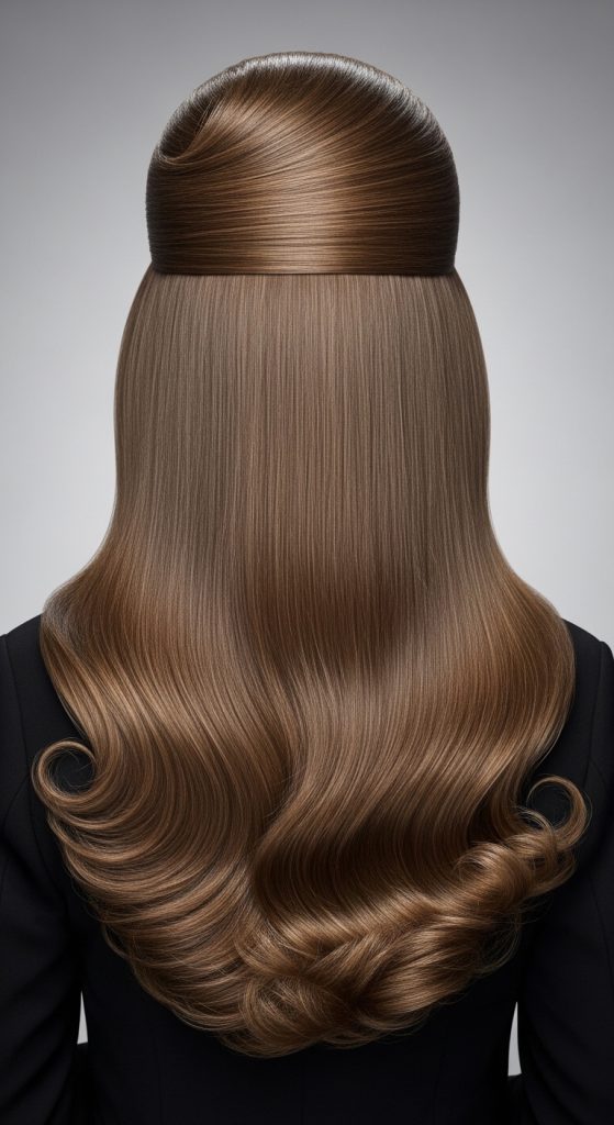 To achieve this, backcomb the crown section lightly. Smooth the top layer. Curl the lower sections. Apply hairspray to maintain volume. This process creates a structured hairstyle.