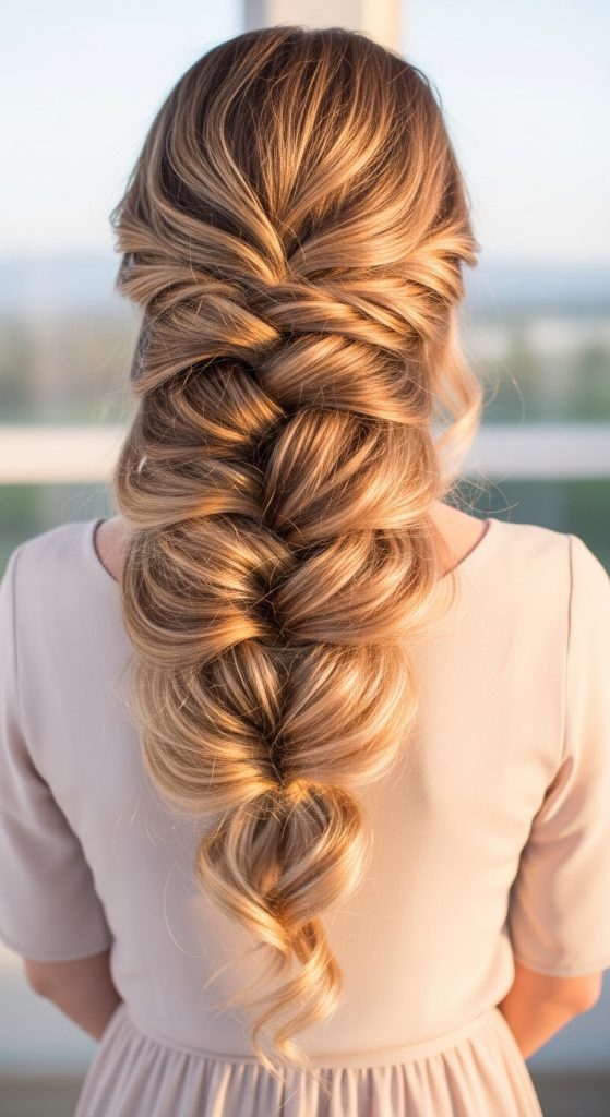 To create this, curl the hair lightly and gather it into a loose braid. Secure the end. Adjust the braid to create fullness. This method produces a controlled hairstyle.
