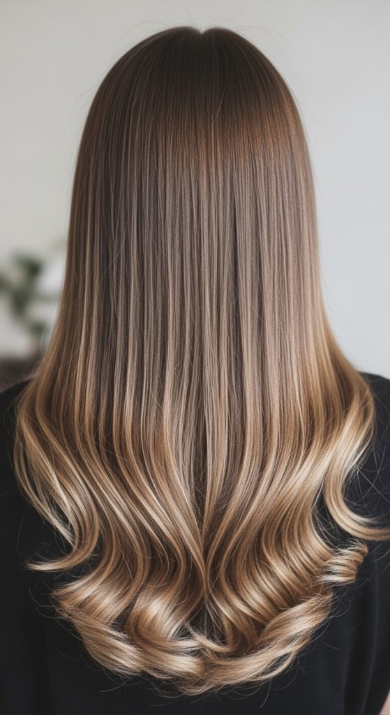This hairstyle keeps the upper length straight while adding curls at the ends. This creates contrast and balance.