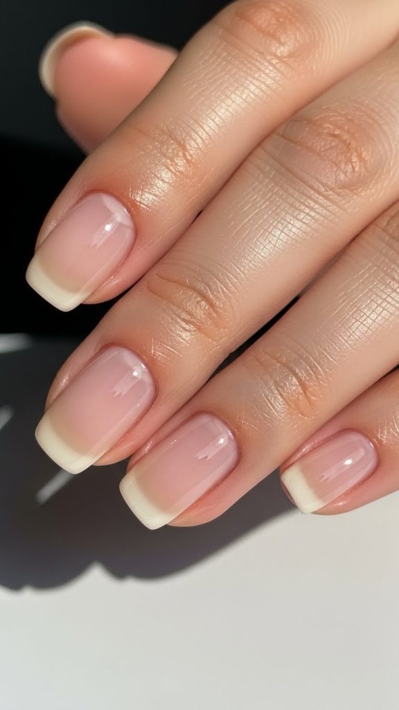 Neutral ombre nails blend two soft shades like nude and white. The transition is gentle and refined.