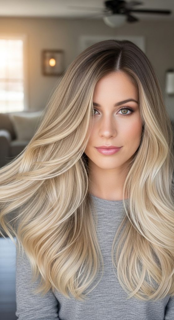 Champagne blonde balayage blends warm beige tones with subtle golden highlights to produce a sophisticated and luminous color effect. This shade combines soft warmth with a slightly neutral finish, making it one of the more refined warm blonde balayage variations. Pinterest ideas frequently feature champagne balayage because it creates brightness without appearing overly yellow or overly cool.