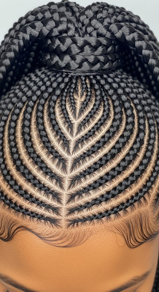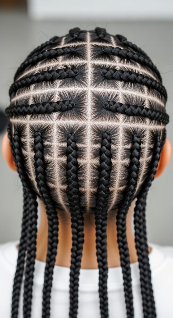 This braid down is especially loved on Pinterest because it creates a salon-quality finish at home. The invisible technique blends crochet loops into the braid structure, hiding the base. It gives the illusion of a clean scalp part and allows flexible styling. While slightly more advanced than basic straight-back cornrows, beginners can still achieve it with patience and neat sectioning.