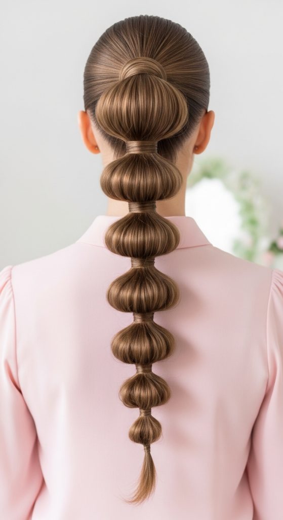 Create a sleek or lightly textured ponytail at mid or low height. Add small elastics every few inches down the ponytail. Gently tug at each section between elastics to create a “bubble” effect. Smooth the top with light hairspray for a polished finish.