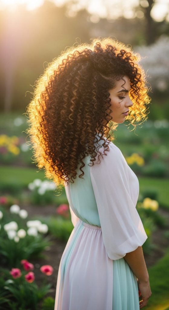 This style keeps curls defined and lifted, making it comfortable and beautiful for all-day wear.