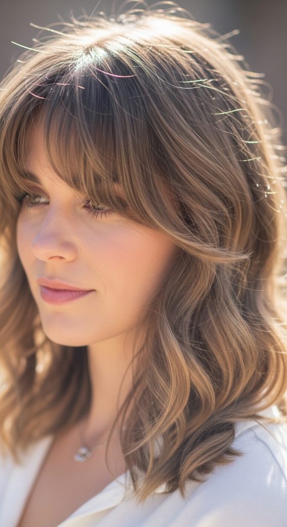 Wispy bangs paired with medium wavy hair create a soft, romantic look. Unlike blunt bangs, wispy bangs are lighter and slightly separated, allowing natural waves to flow without appearing heavy. They add a youthful and airy touch to your overall style.