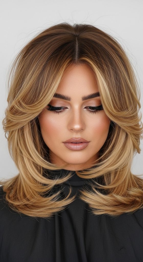 A layered medium cut with strong face-framing pieces is ideal for enhancing natural waves while highlighting your facial features. Unlike subtle layering, this style focuses on shorter front sections that start around the cheekbones or chin and gradually blend into the rest of the hair. It creates dimension, softness, and shape without sacrificing overall length.